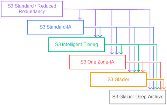 Amazon S3 supports a waterfall model for transitioning between storage classes, as shown in the following diagram.