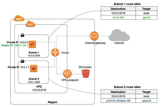 VPC endpoint — Enables you to privately connect your VPC to supported AWS services and VPC endpoint services powered by private link without requiring an internet gateway, NAT device, VPN connection, or AWS Direct Connect connection.