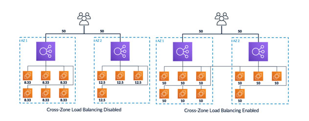 If cross-zone load balancing is enabled, each of the 10 targets receives 10% of the traffic. This is because each load balancer node can route its 50% of the client traffic to all 10 targets.